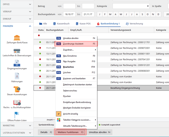 Öffnen Sie den Zuordnungs-Assistenten wie gehabt von Ihrem Bankkonto aus dem Bereich "Finanzen -> Zahlungen Bank/Kasse" per Klick auf "Weitere Funktionen > Zuordnungs-Assistent":