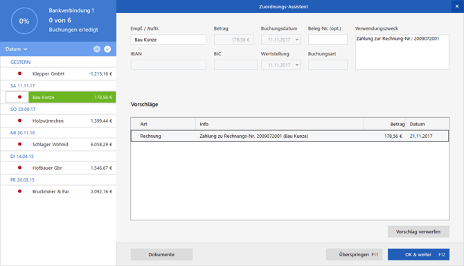 Wird Ihnen ein Vorschlag angeboten, den Sie übernehmen möchten, klicken Sie rechts unten auf "OK & weiter", um den Vorschlag anzunehmen und zur nächsten Zahlung zu springen. Per Klick auf "Vorschlag verwerfen" können Sie auf den Vorschlag verzichten und die Zuordnung frei vornehmen.