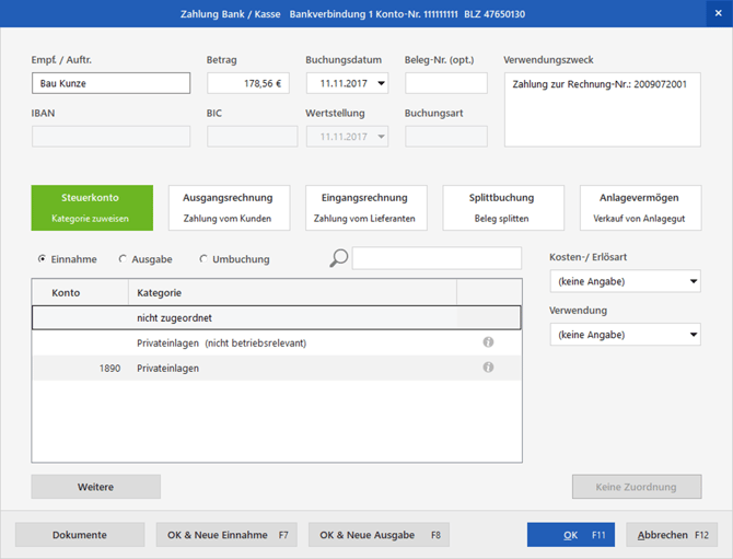 Dieses finden Sie ab jetzt bei einer Einnahme als "Privateinlagen" und bei einer Ausgabe als "Privatentnahme".