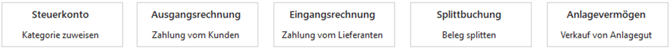 Während beim alten Zuordnungs-Assistenten alle Kategorien (Steuerkonten, Zahlung vom Kunden, Splittbuchung etc.) untereinander in einer Liste dargestellt wurden, ist dies nun über die fünf Schaltflächen gelöst: