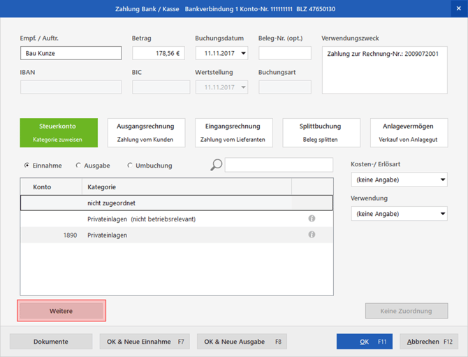 Über "Steuerkonto" können Sie direkt auf ein buchhalterisches Konto buchen. Die weiteren Konten stehen Ihnen durch Klick auf "Weitere" zur Verfügung (sofern unter "Stammdaten > Meine Firma > Einstellungen > Steuer-Einstellungen" die Variante 3 aktiv ist):