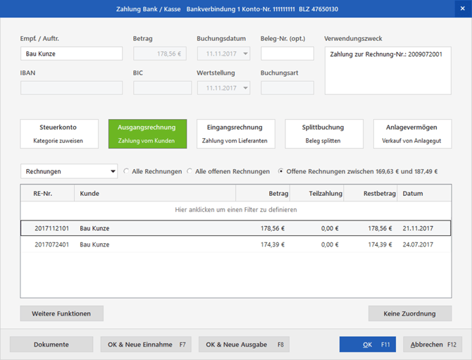 Alternativ können Sie den Zuordnungs-Assistenten auch gezielt per Doppelklick auf eine Zahlung öffnen. Zusätzlich öffnet er sich auch automatisch nach dem Abruf Ihrer Umsätze vom Onlinekonto.