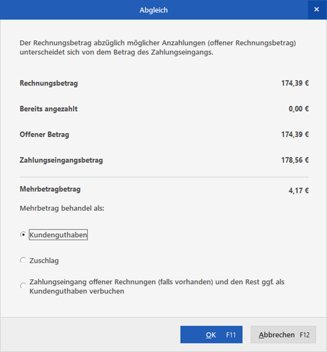 Ist der Betrag der Zahlung nicht identisch mit dem der Rechnung, öffnet sich beim Schließen des Zuordnungs-Assistenten ein Hinweis darüber, was mit der Differenz geschehen soll. Hier können Sie die Differenz direkt als Zuschlag, Gebühren, Skonto oder ähnliches verbuchen: