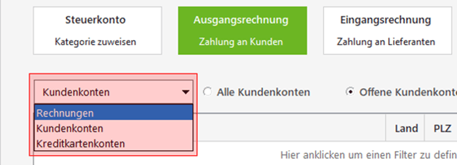 Handelt es sich um eine Zahlung auf ein Kunden- oder Kreditkartenkonto, wählen Sie dies über das DropDown-Menü aus:
