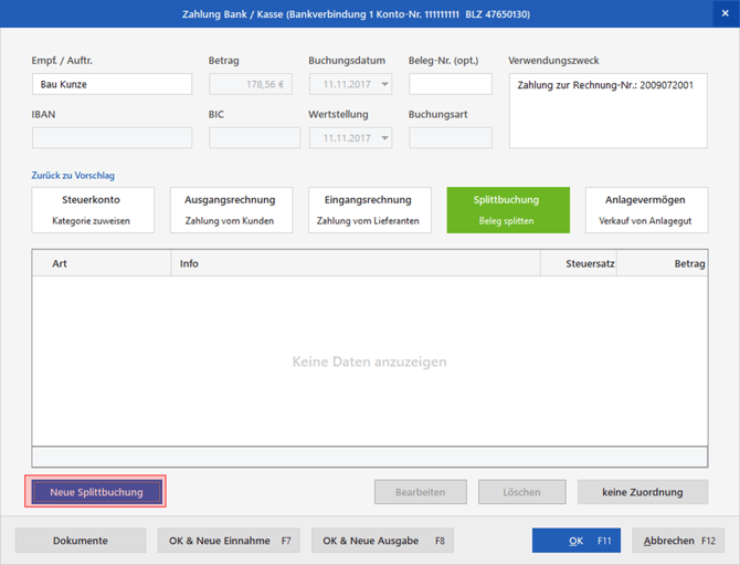 Gibt es mehrere Vorgänge, die mit dieser einen Zahlung beglichen werden sollen, ist die "Splittbuchung" die richtige Wahl. Durch Klick auf "Neue Splittbuchung" öffnet sich das Auswahlmenü: