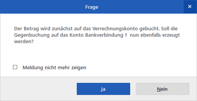 Bestätigen Sie den folgenden Hinweis mit "Ja". WISO MeinBüro Desktop erstellt daraufhin eine Ausgleichsbuchung auf dem Verrechnungskonto, sowie eine Ausgabe auf der Bankverbindung 1: