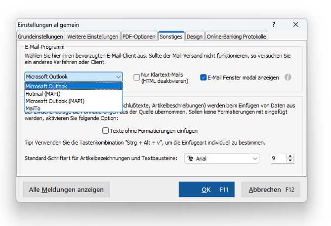 Je nach System und verwendetem E-Mail-Programm kann es notwendig sein, ein anderes E-Mailverfahren auszuwählen. Klicke dazu unter "Datei > Einstellungen > Allgemein…" und dort unter