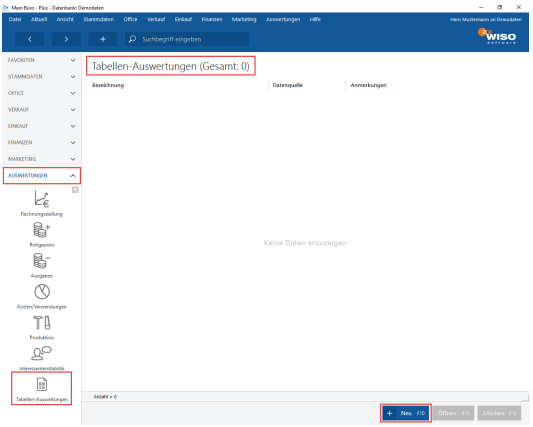 Tabellenauswertung.pdf Über die Tabellen-Auswertungen ist es möglich eigene Auswertungen nach Ihren Wünschen zu erstellen. Diese Auswertungen werden immer anhand der aktuellen Daten aus WISO Mein Büro 365 ermittelt, Sie können also eine Auswertung vorbereiten, speichern und diese immer bei Bedarf mit den aktuellsten Daten einsehen. Darüber hinaus können Sie die ausgegebene Liste nach Excel exportieren oder als PDF-Datei speichern. Da manche Auswertungen zu komplex sind, um diese über die Tabellen-Auswertungen abzubilden bieten wir alternativ die individuelle Erstellung einer Auswertung an. Diese kostenpflichtige Leistung können Sie gern mit uns über die Einrichtungshotline (+49 2735/77 66 50 01) besprechen. Erstellen eigener Tabellen-Auswertungen Über die nächsten Punkte erfolgt beispielhaft eine Auswertung über alle bezahlten Rechnungen von 2016. Diese Liste lässt sich auch direkt über die Filterfunktion in der Rechnungsübersicht erstellen. Der Vorteil der Tabellen-Auswertungen ist allerdings (wie oben beschrieben), dass Sie die Filter speichern können. Die Tabellen-Auswertung ist später erneut mit wenigen Klicks aufrufbar. Öffnen Sie dazu zuerst die „Tabellen-Auswertungen“ unter dem Menüpunkt „Auswertungen“ (eventuell ist es dazu erforderlich dazu etwas nach unten zu scrollen, da dies der letzte Programmpunkt in diesem Programmbereich ist). In der folgenden Ansicht sehen Sie später die einzelnen, von Ihnen erstellten Auswertungen. Diese lassen sich dann über einen Doppelklick öffnen. Zum Erstellen einer neuen Auswertung klicken Sie auf „Neu“ oder drücken die Funktionstaste „F10“.
