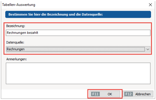 Unter Bezeichnung tragen Sie nun die Bezeichnung ein, unter der Ihre Tabellen-Auswertung gespeichert wird. Die Datenquelle steht für den Bereich, über den Sie Ihre Auswertung erstellen möchten. Möchten Sie beispielsweise eine Auswertung über die Kunden erstellen, wählen Sie als Datenquelle „Kunden“ aus. Möchten Sie verkaufte Artikelpositionen auswerten, wählen Sie „Artikelverwendungen“ aus. Für den Beispielfall wird als Datenquelle „Rechnungen“ ausgewählt. Das Feld „Anmerkungen“ ist nicht auszufüllen und dient nur für kurze Anmerkungen zur jeweiligen Auswertung. Klicken Sie auf „OK“.