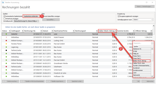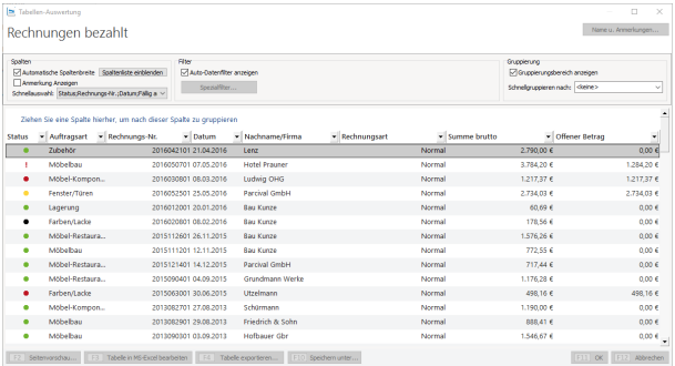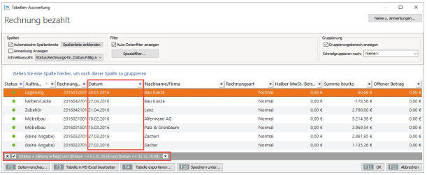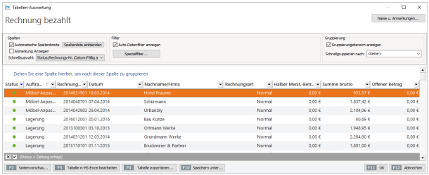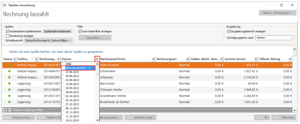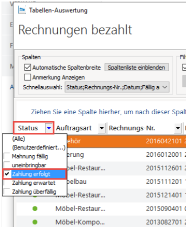 Die Übersicht zeigt anschließend ausschließlich Rechnungen mit dem „Status“ bezahlt.