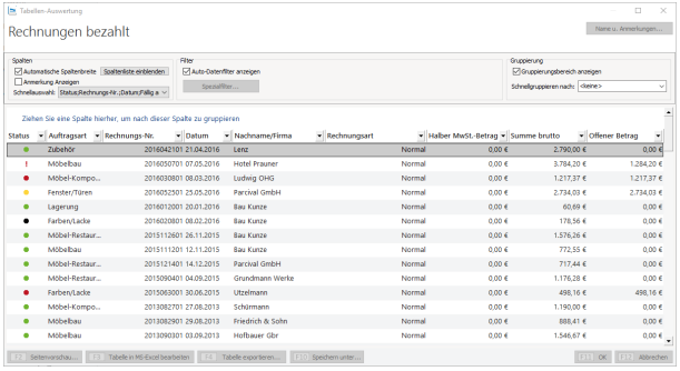Nachdem Sie dieses Fenster über „OK“ geschlossen haben, sehen Sie eine Liste über alle bezahlten Rechnungen des frei festgelegten Zeitraums.