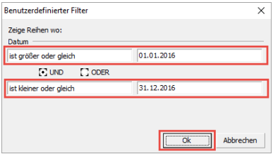 Hier können Sie nun einen bestimmten Zeitraum auswählen. Orientieren Sie sich an diesem Beispiel, in dem alle Rechnungen des Jahres 2016 ausgeben werden sollen.