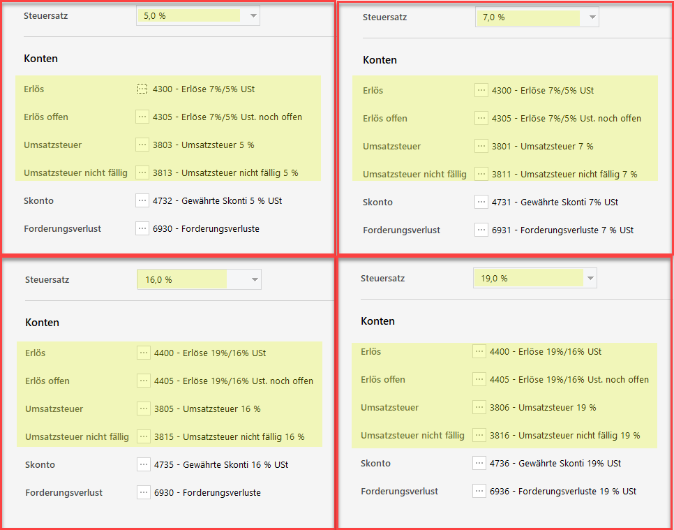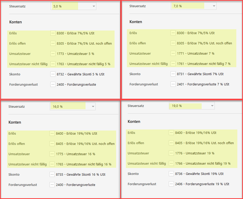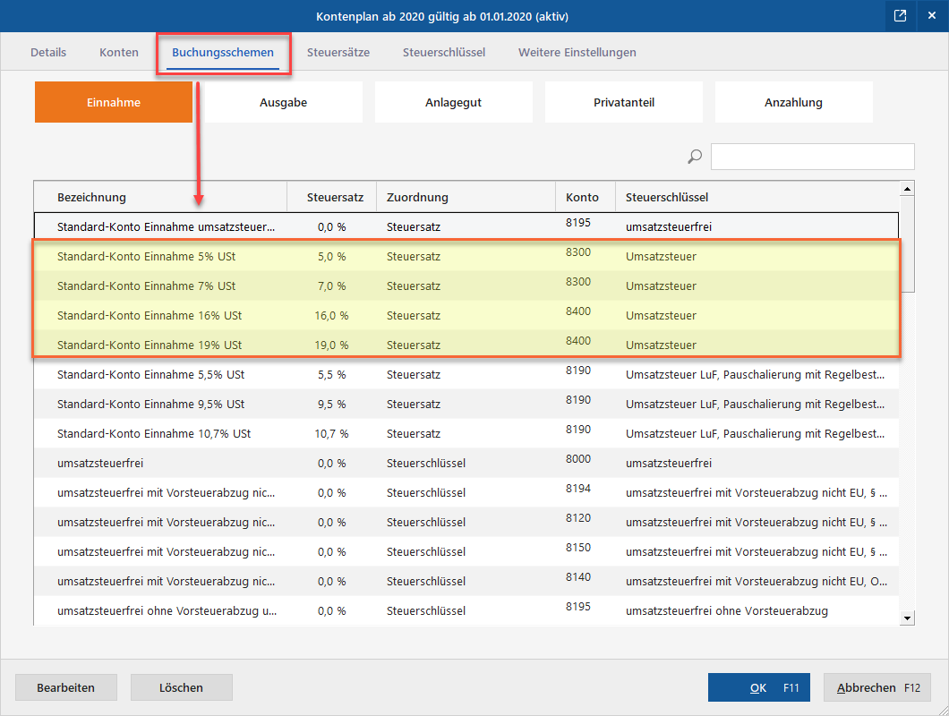 Öffnen Sie zur Korrektur bitte den Bereich "Stammdaten > Finanzbuchhaltung > Kontenplan bearbeiten > Kontenplan ab 2020" und darin den Reiter "Buchungsschemen". In diesem gilt es die Einträge für die Steuersätze 5%, 7%, 16% sowie 19% zu überprüfen.