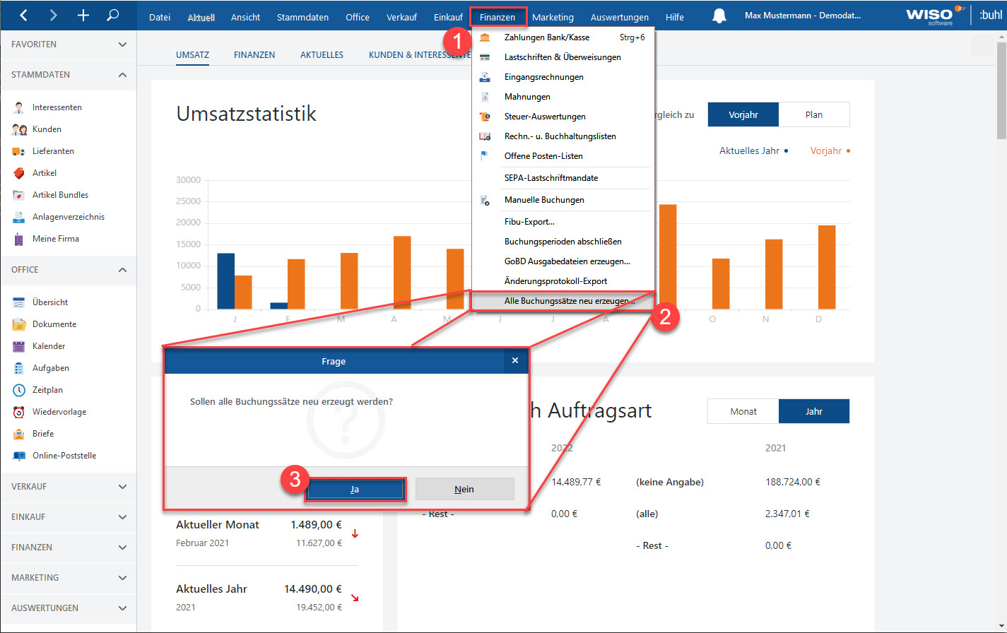 Nachdem Sie die Einstellungen angepasst haben ist es erforderlich, dass Sie über "Finanzen > Alle Buchungssätze neu erzeugen..." die Buchungen neu aufbauen lassen. Beachten Sie bitte, dass Sie zuvor eine Datensicherung erstellen, alle weiteren Benutzer von der Datenbank abmelden (Netzwerkbetrieb) und einige Zeit einplanen. Starten Sie den Prozess bestenfalls zum Ende des Arbeitstages.