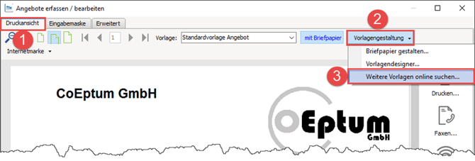 Öffnen Sie im Bereich "Verkauf > Angebote" über "Neu" oder "Bearbeiten" ein neues oder bestehendes Angebot. Wechseln Sie in die "Druckansicht" und klicken anschließend auf "Vorlagengestaltung > Weitere Vorlage online suchen…".
