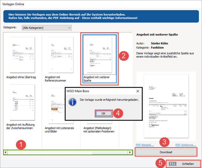 Es öffnet sich nachstehendes Fenster, scrollen Sie nach ganz rechts und wählen die Vorlage "Angebot mit weiterer Spalte". Klicken Sie anschließend auf "Download" und dann auf "OK". Verlassen Sie das Fenster mit "Schließen".