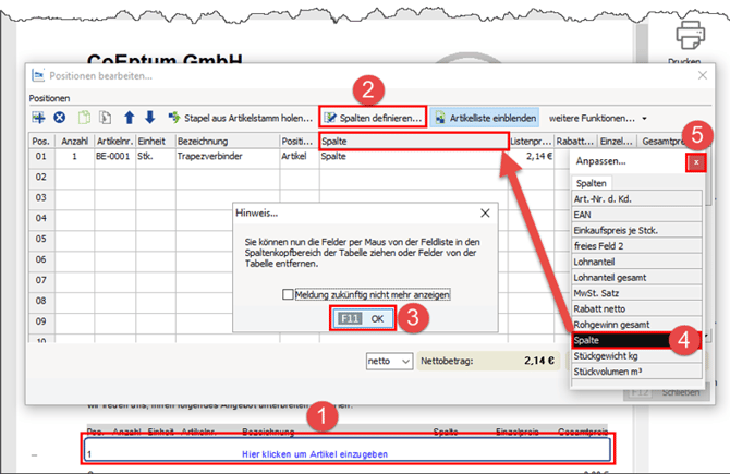 Sie befinden sich wieder in der Druckansicht des Vorgangs. Klicken Sie bitte auf "Hier klicken um Artikel einzugeben". Arbeiten Sie mit der "Eingabemaske" wechseln Sie in diesen Bereich, die notwendigen Einstellungen sind identisch. Klicken Sie auf "Spalten definieren" und bestätigen den Hinweis mit "OK". Ziehen Sie jetzt Ihre angelegte und frei benannte Spalte mit der gedrückten linken Maustaste an die gewünschte Stelle. Schließen Sie das Fenster zum "Anpassen…" über das X.