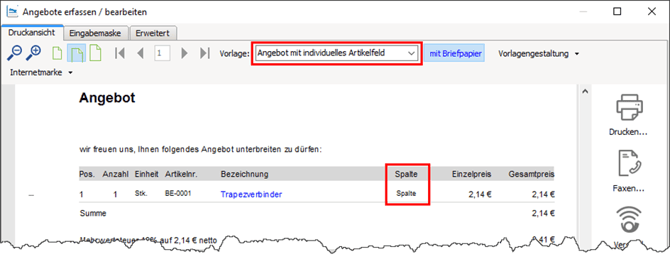 Um in Ihren Vorgängen eine weitere Spalte hinzuzufügen, gehen Sie bitte nach folgender Anleitung vor. Beachten Sie bitte, dass Sie die Vorlagen für die einzelnen Vorgangsarten (Angebot, Auftrag, Lieferschein, Rechnung und Gutschrift) einzeln herunterladen. In dieser Anleitung werden die Schritte innerhalb eines Angebots vorgenommen.