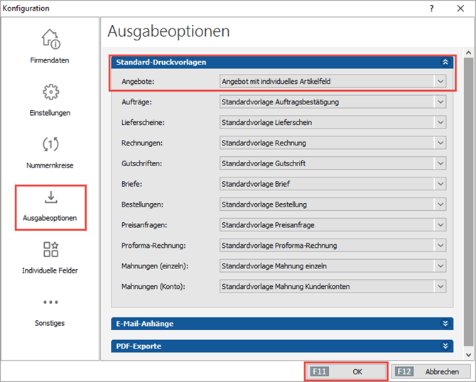 Möchten Sie die Vorlagen mit "Weiterer Spalte" standardmäßig verwenden. Wechseln Sie in den Bereich "Stammdaten > Meine Firma > Ausgabeoptionen" und hinterlegen bei den gewünschten Vorgängen die Vorlage. Speichern Sie Ihre Änderungen mit "OK".
