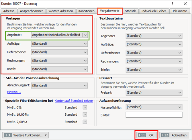 Möchten Sie diese Vorlagen lediglich bei bestimmten Kunden verwenden, öffnen Sie den entsprechenden Kundendatensatz im Bereich "Stammdaten > Kunden". Wechseln Sie auf den Reiter "Vorgabewerte" und hinterlegen, wie auf folgendem Dialog dargestellt, die gewünschten Vorlagen. Speichern Sie die Änderungen mit "OK".