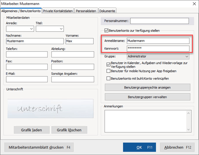 Stellen Sie vorab bitte sicher, dass unter "Stammdaten > Mitarbeiter" alle Mitarbeiter mit individuellen Zugangsdaten angelegt wurden.