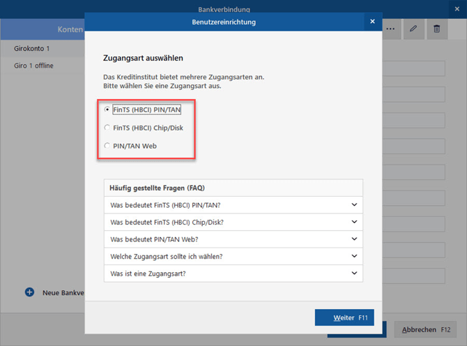 Dadurch wird der gleiche Assistent wie bei der Einrichtung der Bankverbindung gestartet, in dem Sie nun die neuen Benutzerdaten hinterlegen können. Wählen Sie bitte die für Sie zutreffenden Zugangsart aus und klicken Sie auf "Weiter". Hinterlegen Sie bitte die erfragten Informationen und führen Sie den Assistenten zu Ende.