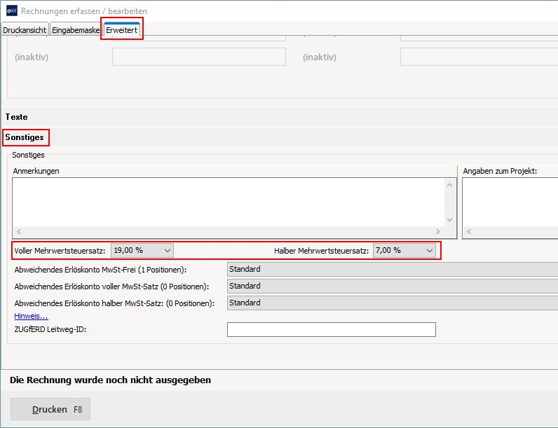 Um innerhalb eines Vorgangs die Mehrwertsteuer umzustellen, klicken Sie oben links auf "Erweitert". Im unteren Bereich können Sie nun den vollen und halben Mehrwertsteuersatz umstellen.