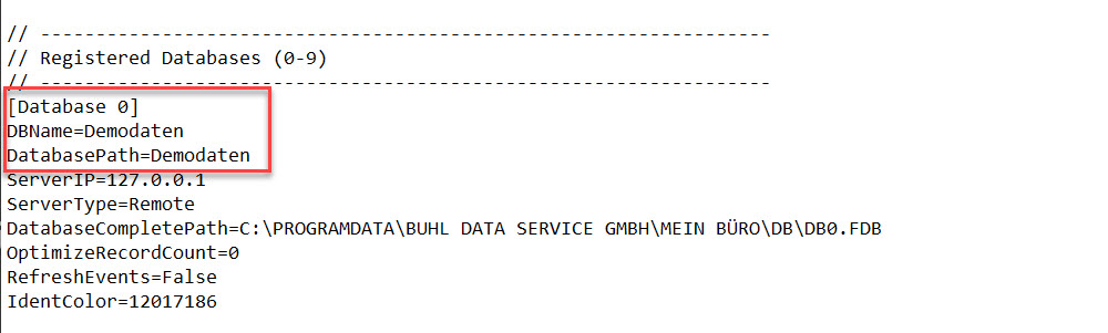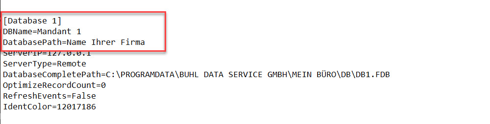Jeder der gleich aufgebauten Datenblöcke steht für einen potenziell möglichen Mandanten in der Software WISO MeinBüro Desktop. Wenden Sie daher bitte die gezeigte Logik anschließend auf die von Ihnen aktiv eingesetzten Mandanten an. Das bedeutet, bei dem Eintrag "[Database1]" tragen Sie in den Feldern "DBName=" und "DatabasePath=" die entsprechende Zeile "Mandant 1" sowie den Namen Ihrer Firma ein.