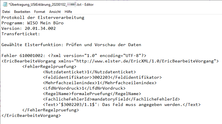 Meldung: "Fehler 610001002: Das Feld muss angegeben werden." beim Versand der Umsatzsteuererklärung