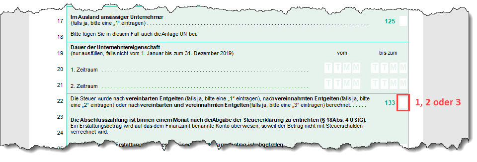 Es ist erforderlich, dass Sie auf Seite 1 in der Zeile 22 im Feld 133 die Ziffer "1", "2", oder "3" eintragen, je nachdem welche auf Sie zutrifft. Im Zweifel sprechen Sie bitte Ihren Steuerberater an. Prüfen Sie im Anschluss den Versand erneut.