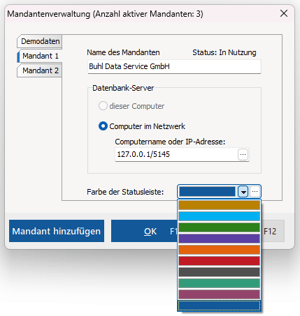 Als zusätzliche Unterstützung und für Orientierung auf den ersten Blick kannst du pro Mandant eine andere Farbe für die Statusleiste definieren. Die jeweiligen Daten der Mandanten werden völlig unabhängig voneinander bearbeitet und verwaltet. Jeder Mandant nutzt standardmäßig eigene Einstellungen, Druckvorlagen und vieles mehr.