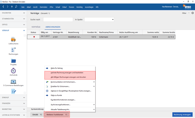 Nachdem du alle Vertragsinhalte festgelegt hast, kannst du diese bei Bedarf einzeln abrechnen und die nächste Rechnung erzeugen oder auch gesammelt über die Funktion "alle fälligen Rechnungen erzeugen und drucken".