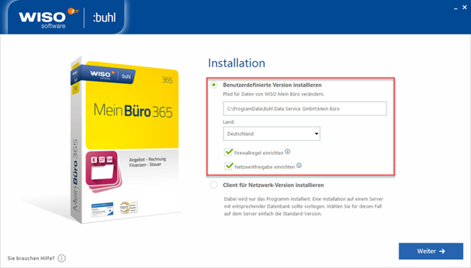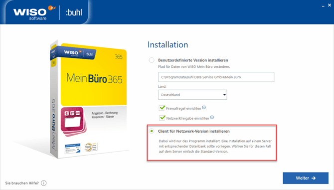 Führen Sie zuerst in die Installation auf dem Server durch. Auf dem Server ist in jedem Fall die vollständige Installation durchzuführen (Der Standardinstallationspfad lautet ab der neuen Version: "C:\ProgramData\Buhl Data Service GmbH\Mein Büro". Gegebenenfalls wird Ihnen der Ordner nicht angezeigt, unter diesem Link erhalten Sie dazu Hilfe. Die aktuelle Installationsroutine für die Basisversion von WISO Mein Büro ist hier bereitgestellt.