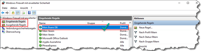 Die Freigabe wird in den Netzwerkprofilen Domänen Netzwerk und Privates Netzwerk aktiviert. Bei dem Profil Öffentliches Netzwerk ist die Datenbank nicht freigegeben!