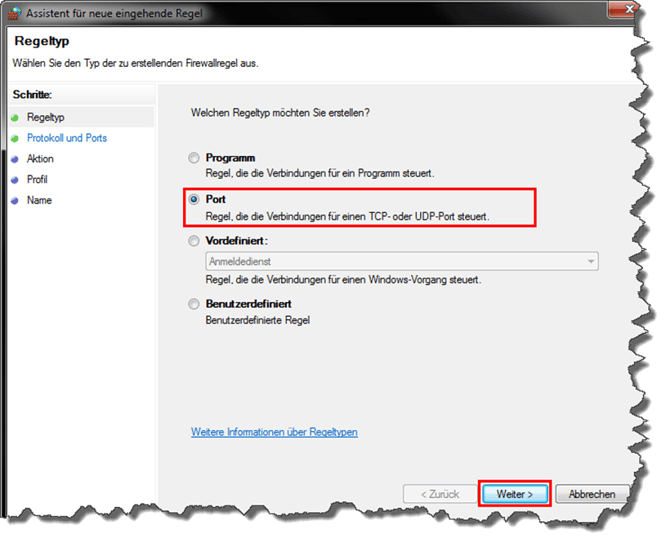 Wählen Sie entsprechend des folgenden Screenshots den Punkt "Port" aus und klicken auf "Weiter".