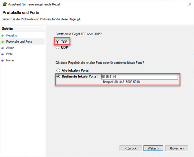 Im nächsten Schritt wählen Sie "TCP" und bei "Bestimmte lokale Ports: 5145-5146".