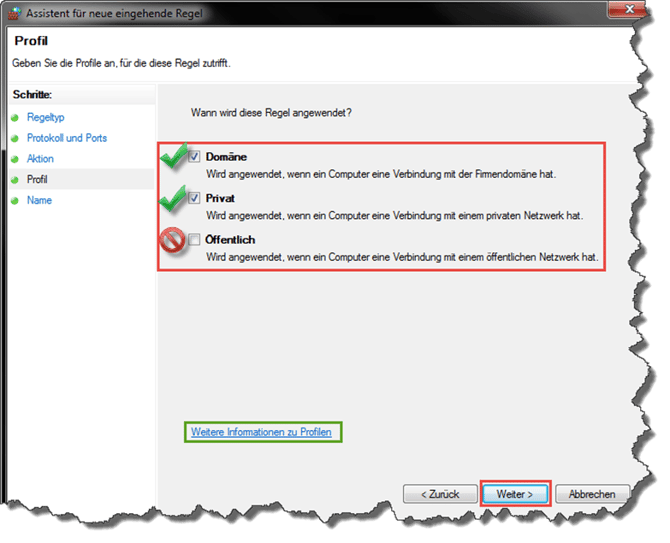 Im nächsten Fenster ist es empfehlenswert, aber nicht in jedem Fall korrekt, die Haken bei "Domäne" und "Privat" zu setzen und ihn bei "Öffentlich" weg zu lassen. Weitere Informationen zu den Unterschieden erhalten Sie unter dem grün gerahmten Link.