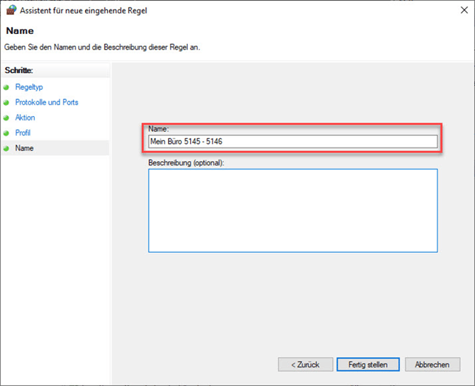 Abschließend vergeben Sie einen Aussagekräftigen Namen für die Ausnahmeregel und verlassen den Assistenten mit "Fertigstellen". Beachten Sie bitte auch die nachfolgenden Hinweise!