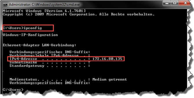 Es ist empfehlenswert, dass Sie dem Server-Rechner eine feste IP-Adresse zuweisen. Um diese zu ermitteln, drücken Sie auf Ihrer Tastatur die "Windows-Taste + R" und geben Sie in der geöffneten Funktionsausführung "cmd" (ohne Anführungszeichen) ein. Bestätigen Sie die Eingabe mit "Ok". Geben Sie in der geöffneten Eingabeaufforderung den Befehl "ipconfig" ein um die Rückmeldung zur genutzten IP-Adresse zu erhalten.