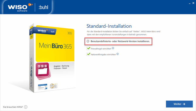 Wählen Sie entweder die "Standard-Installation" und klicken auf "Weiter" oder wählen alternativ die "Benutzerdefinierte- oder Netzwerk-Version installieren" aus.