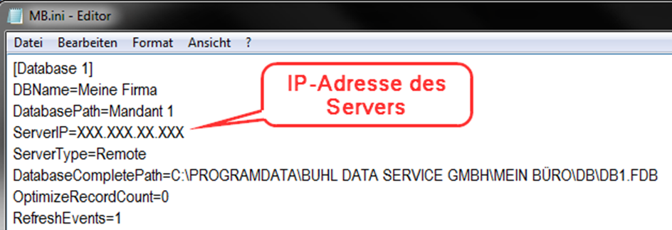 - Überprüfen Sie auf allen Client-Installationen die Datei "MB.ini". Die Datei finden Sie im Installationsverzeichnis der Software unter "C:\ProgramData\Buhl Data Service GmbH\Mein Büro". Gegebenenfalls wird Ihnen der Ordner nicht angezeigt, unter diesem Link erhalten Sie dazu Hilfe.
