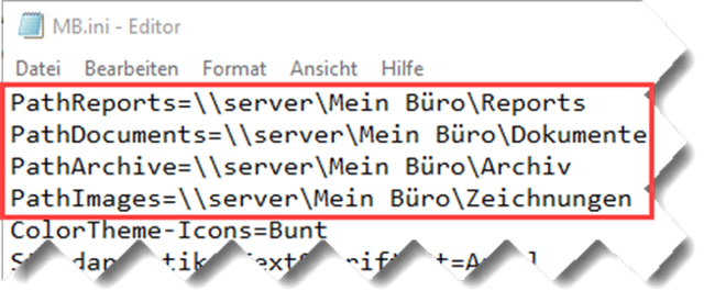 Falls neben der Datenbank auch die Druckvorlagen, Zeichnungen und Dokumente zentral verwendet werden sollen, ist es erforderlich, dass auf jedem Client in der "MB.ini" das auf dem Server freigegebene von WISO Mein Büro verwendete Verzeichnis (in diesem Fall "C:\ProgramData\Buhl Data Service GmbH\Mein Büro") zu hinterlegen ist.