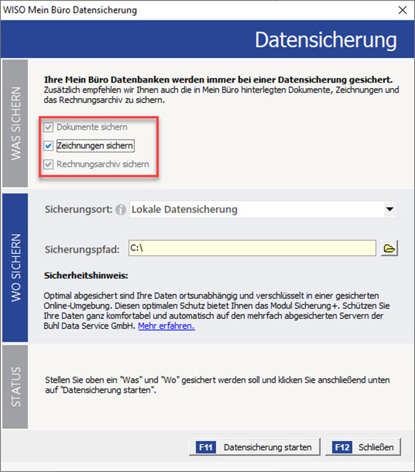 - Erstellen Sie im Programm eine Datensicherung über "Datei > Datensicherung > Manuelle Datensicherung". Achten Sie darauf, dass alle Haken bei den Einträgen "Dokumente sichern", "Zeichnungen sichern" und "Rechnungsarchiv sichern" gesetzt sind. Zudem wählen Sie als Sicherungspfad bitte nicht das Installationsverzeichnis.