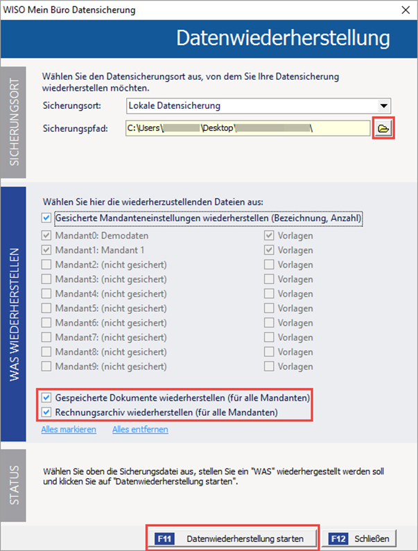- Wechseln Sie zu "Datei > Daten wiederherstellen" um die zuvor erstellte Datensicherung wieder einzuspielen. Achten Sie auch hier wieder darauf, dass Sie die "Dokumente" und das "Rechnungsarchiv" mit auswählen. Beachten Sie hierzu auch die untenstehende Darstellung. Eine ausführliche Anleitung zur Wiederherstellung Ihrer Daten, auch mit dem Modul Sicherung+, finden Sie in der FAQ unter diesem Link in Kapitel 4.