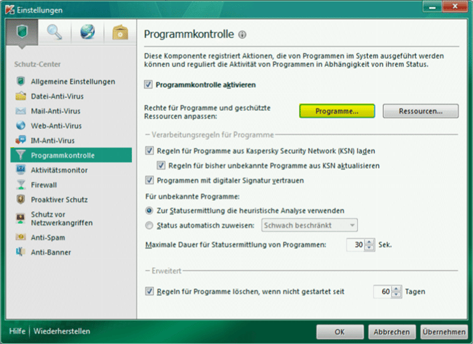 Oder unter den "Einstellungen -> Programmkontrolle" und Klick auf "Programme":
