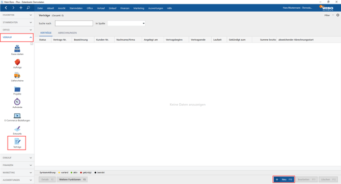 Zur Erstellung von Verträgen gibt es zwei Möglichkeiten unter WISO MeinBüro Desktop. Zum einen können Sie per Rechtsklick auf eine bestehende Rechnung klicken, dann auf "Vertrag erstellen", zum anderen geht dies im Bereich "Verkauf > Verträge". Klicken Sie dazu auf "Neu":