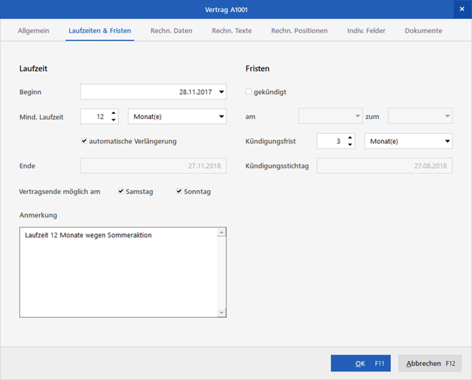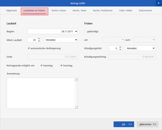 Zusätzlich können Sie festlegen, ob ein Vertragsende am Samstag und Sonntag zulässig ist, sowie weitere Anmerkungen zum Vertrag hinterlegen.