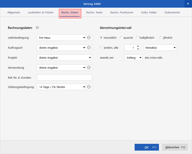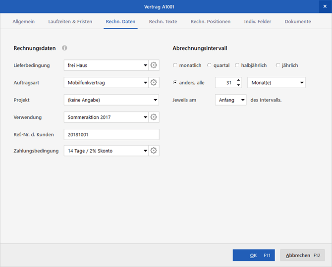 Für das "Abrechnungsintervall" stehen die Intervalle monatlich, quartal, halbjährlich oder jährlich zur Verfügung. Sie können die Intervalle aber auch relativ frei definieren. Legen Sie darunter fest, ob die Verträge jeweils am Anfang oder Ende des Intervalls abgerechnet werden sollen.