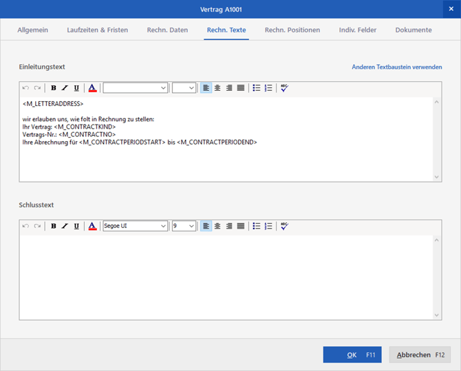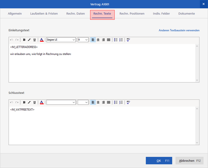 Klicken Sie anschließend auf "OK" und zurück in der Auswahl der Textbausteine erneut auf "OK". Für diesen Vertrag ist jetzt der richtige Textbaustein hinterlegt: