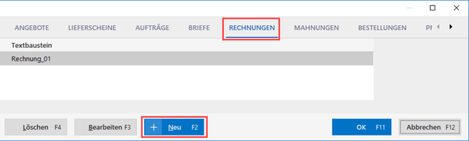 Die Auswahl der Textbausteine öffnet sich. Klicken Sie hier auf Neu: